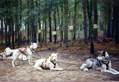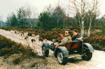 Unsere Besucher können auf einer Führung aus erster Hand einen Eindruck gewinnen, warum diese freundlichen Hunde zu so großartigen Leistungen unter härtesten Bedingungen fähig sind. Wer Hundewelpen liebt, kann hier mit ihnen spielen und sich von ihrem liebenswerten Wesen überzeugen. Bei ihnen beginnend, kann der Weg zum Superathleten nachvollzogen werden. Wer erfahren möchte, wie diese Hunde ihre unglaublichen Leistungen erbringen, kann mit dem Beginn der kühleren Temperaturen im Herbst auf einer Wagenfahrt unmittelbar den Geist der Huskys erfahren. Die optimale Arbeitstemperatur für diese Hunde beträgt -15° C und darunter. Aus diesem Grunde dürfen sie unter unseren mitteleuropäischen Witterungsbedingungen nur mit großer Vorsicht eingesetzt werden. Zugarbeit im Sommer wäre vergleichbar einem Läufer, der im Sommer mit dickem Skianzug einen Marathon absolviert. Deshalb bitten wir unsere Gäste zu verstehen, daß sich Uhrzeit und Länge der Fahrten nach den Bedürfnissen der Hunde zu richten haben. Bei Temperaturen über +15° C sind gar keine, bei 10 - 15° C nur eingeschränkte Fahrten möglich. Luftfeuchtigkeit und Luftbewegung spielen zusätzlich eine Rolle. Der Schlitten wird bei diesen Fahrten durch ein abgespecktes PKW-Chassis ersetzt, das 2 Personen tragen kann und durch 4 gebremste Räder die Sicherheit des Husky-Power gewährleistet. Mit 2 solcher Wagen, jeweils gezogen von bis zu 14 Hunden, kann die Erlebnistour durch Heide und Wald dann beginnen.
